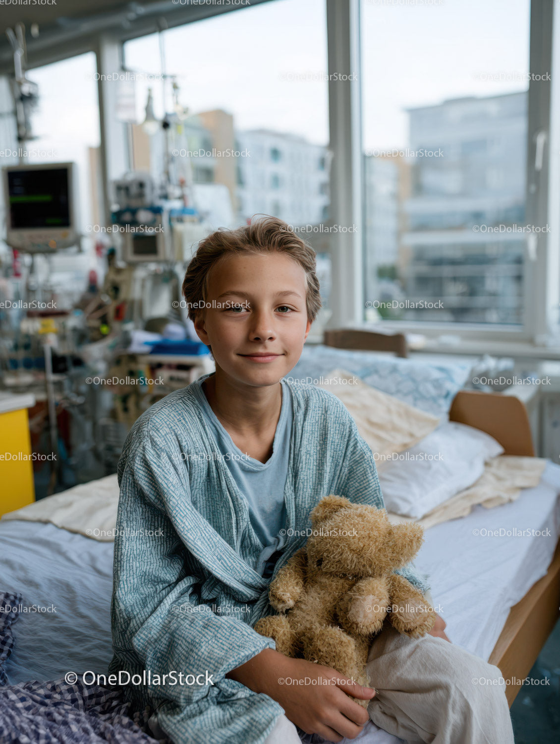 Chłopiec z misiem pluszowym w sali szpitalnej ze sprzętem medycznym