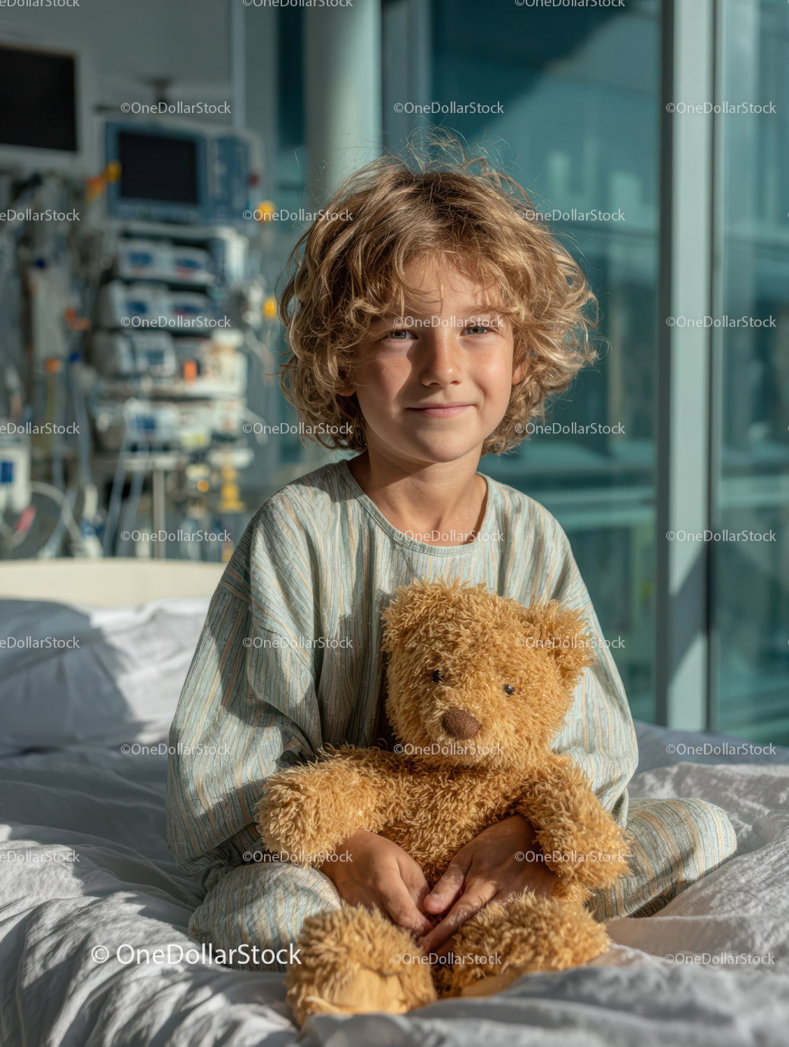 Chłopiec z misiem pluszowym w nowoczesnej sali szpitala pediatrycznego
