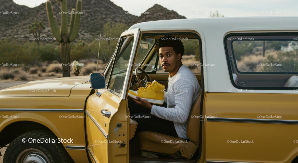 Młody mężczyzna w zabytkowym samochodzie trzymający żółte trampki na pustyni