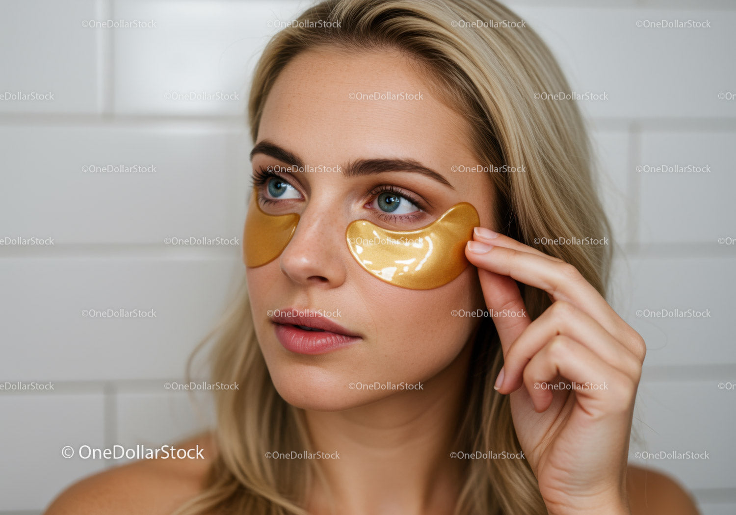 Młoda kobieta relaksuje się ze złotymi plastrami pod oczy, aby odmłodzić skórę