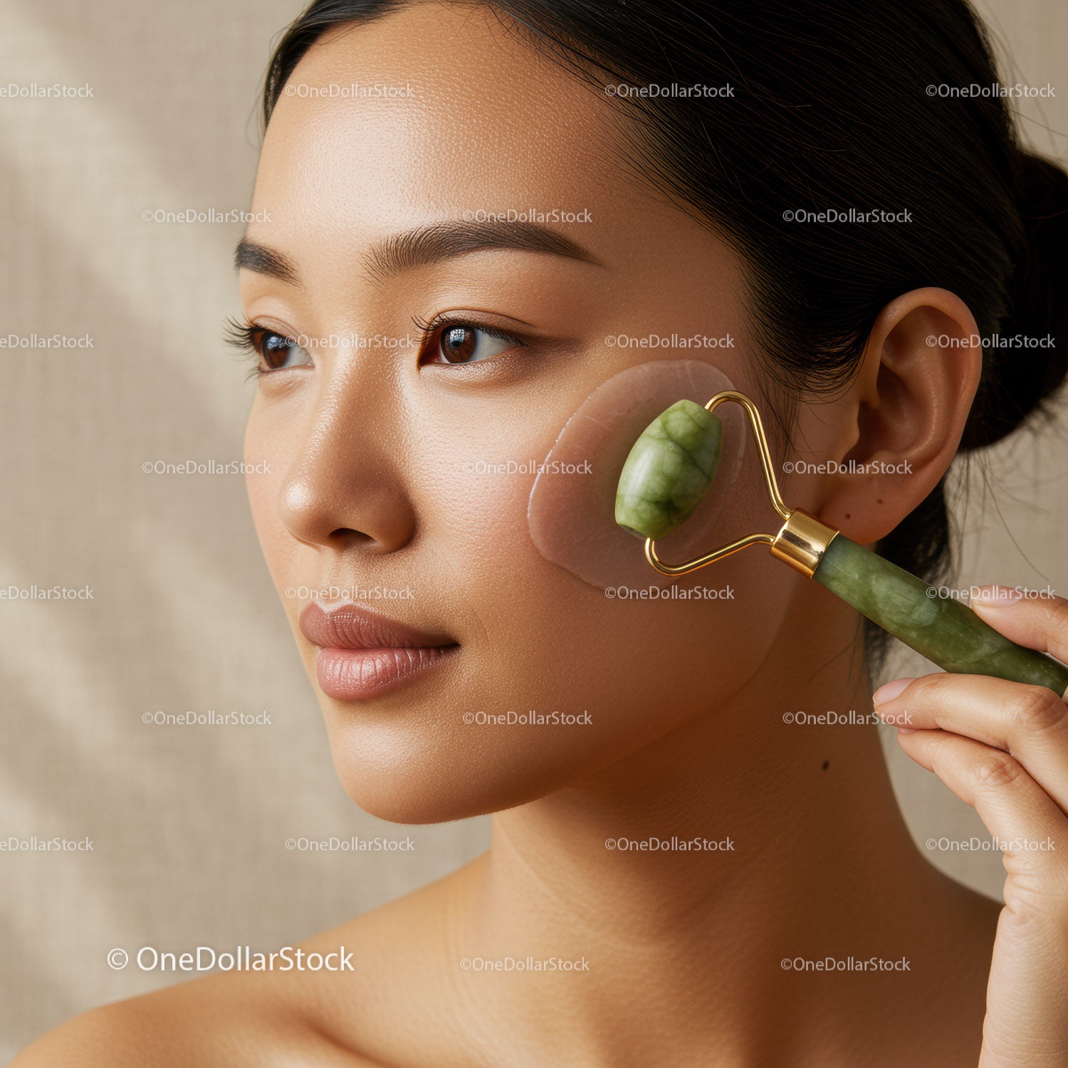 Młoda kobieta wykonuje masaż twarzy zielonym wałkiem jadeitowym, który sprzyja zdrowiu skóry i relaksowi. Ma nieskazitelną cerę, zadbane brwi i pogodny wyraz twarzy. Neutralne tło podkreśla dbałość o siebie i naturalne piękno. Wałek jadeitowy, kojarzony z odmładzaniem i ujędrnianiem skóry, tworzy uspokajającą i luksusową atmosferę, idealną do zabiegów spa, kosmetycznych i wellness.