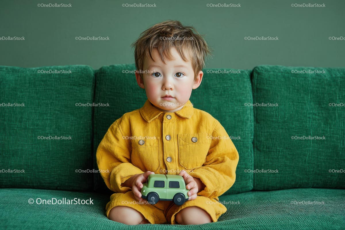 Adorable Child in Yellow on a Green Sofa Playing with Toy Car