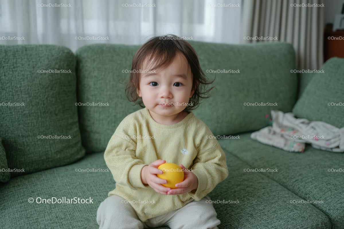 Adorable Toddler Holding Yellow Ball on Green Couch