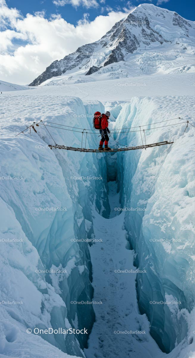Adventurer Crossing Ice Bridge Over Crevasse in Snowy Mountains