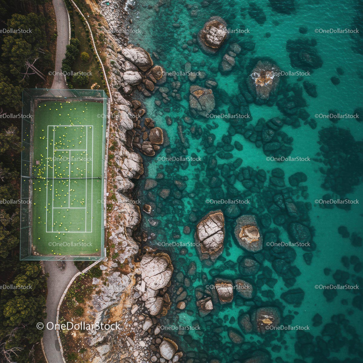 Aerial View of Coastal Tennis Court and Turquoise Sea