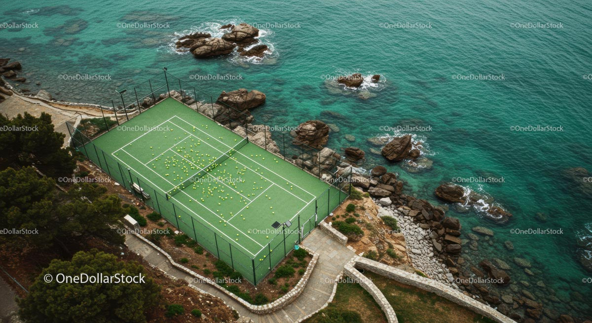 A striking aerial view features a green tennis court nestled along a breathtaking coastline. The turquoise waters of the ocean create a stunning backdrop for a vibrant sporting scene. Tennis balls scattered across the court add a playful touch, enhancing the dynamic atmosphere. Perfect for capturing the spirit of outdoor sports in a picturesque setting.