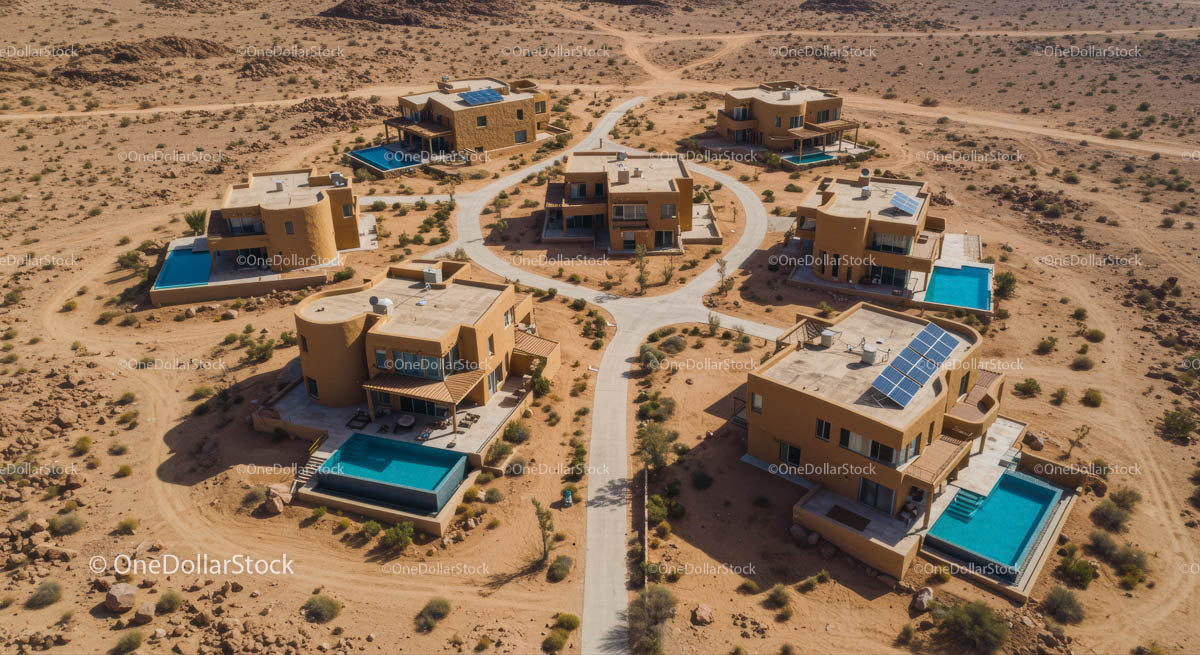 Aerial View of Luxurious Desert Villas with Pools