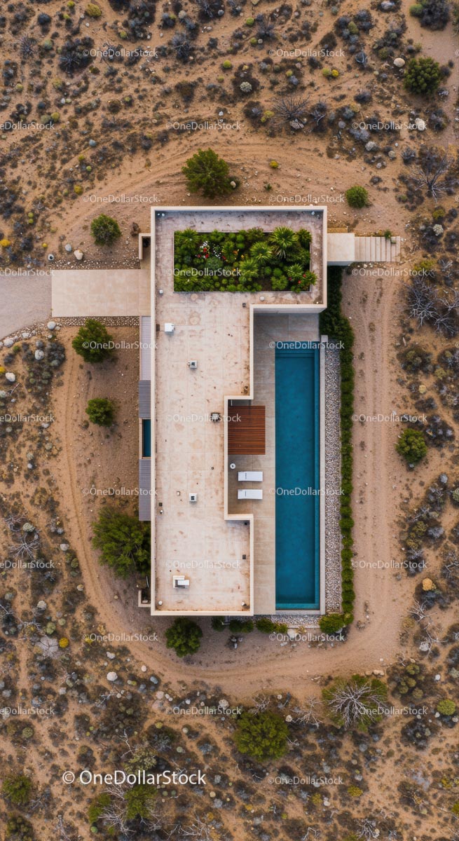 Aerial View of Modern Desert Home with Pool and Garden