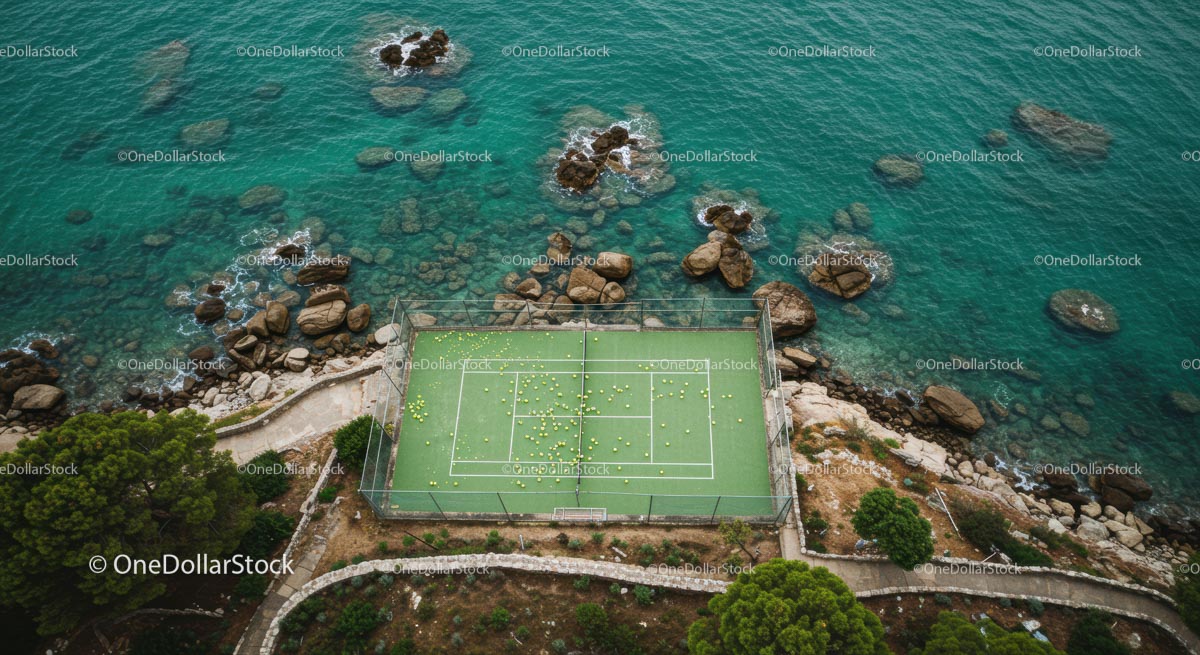 An aerial perspective captures a green tennis court perched on the edge of a rugged coastline. Below, the turquoise waves gently lap against the rocks scattered along the shore. This coastal setting combines outdoor sports with the serene beauty of the ocean, creating a unique and picturesque scene. Ideal for conveying themes of leisure, nature, and recreation in a seaside environment.
