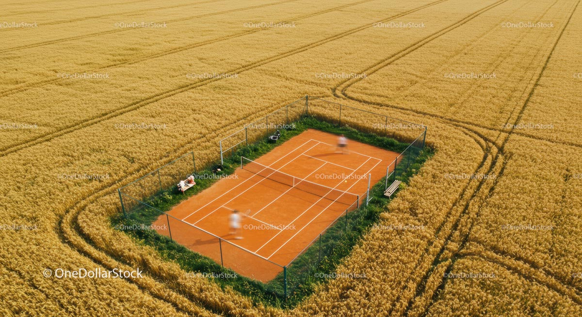 An isolated tennis court nestles amidst vast golden wheat fields, offering a stunning contrast between the vibrant orange clay and the lush countryside. The aerial perspective highlights the unique setting, showcasing the beauty of outdoor sports in a rustic environment. Perfect depiction of leisure and nature in harmony, ideal for conveying concepts of summer activities, rural charm, and recreational simplicity.