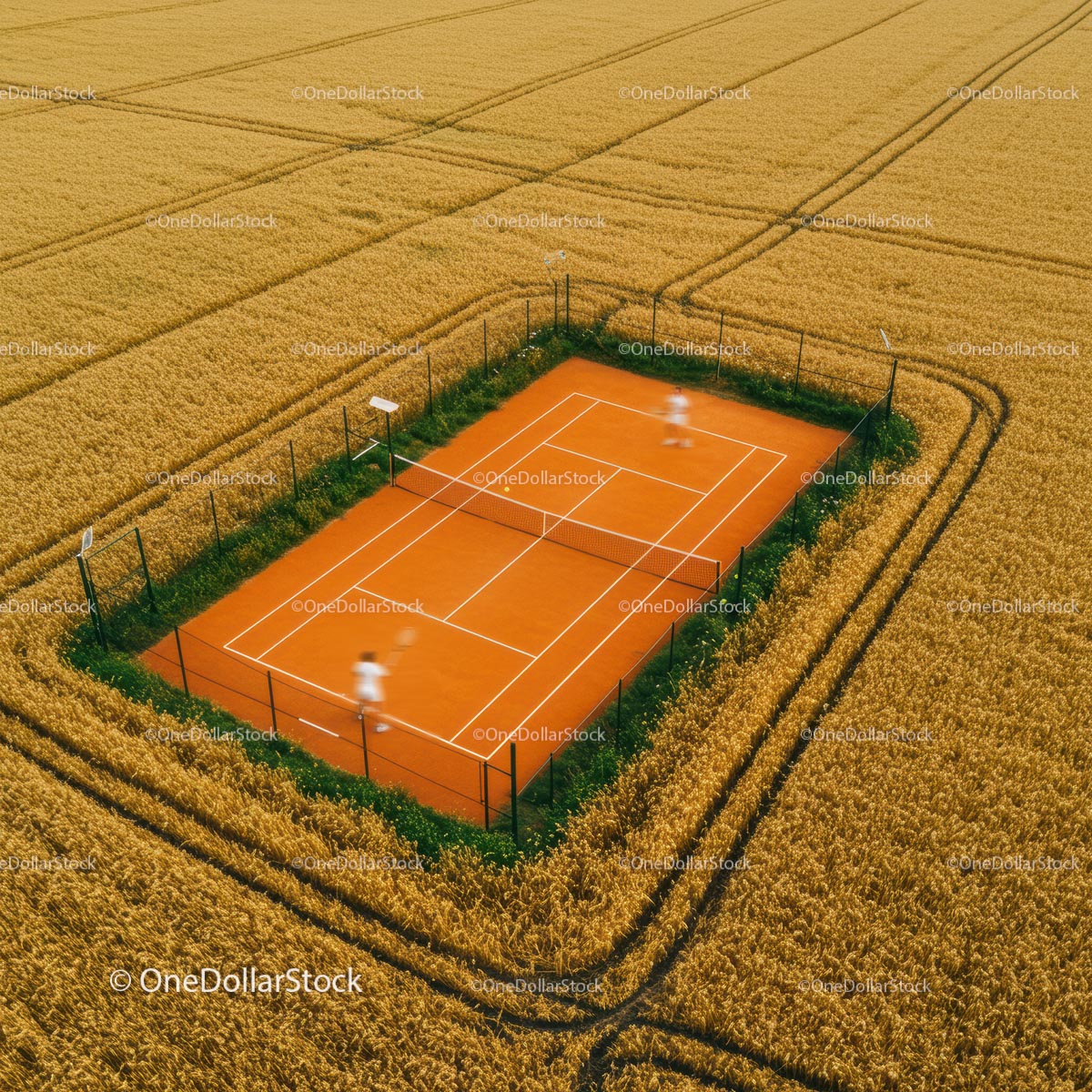 A vibrant tennis court nestled within a vast field of golden wheat creates a stunning contrast in this aerial view. The vibrant orange clay court stands out against the lush, harvest-ready crops, capturing the essence of recreational sports in a rural setting. Players in motion add a dynamic element, highlighting the joy of outdoor activities in the summertime countryside.