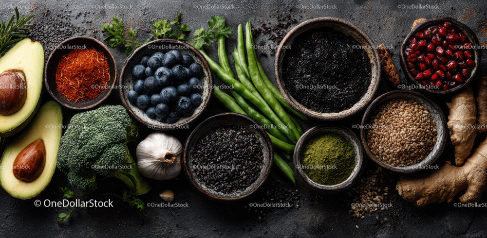 Assorted Fresh Vegetables and Superfoods on Dark Surface