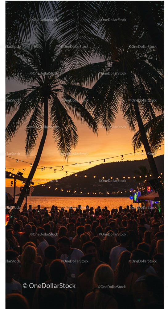 Beach Party at Sunset with Palm Trees and String Lights