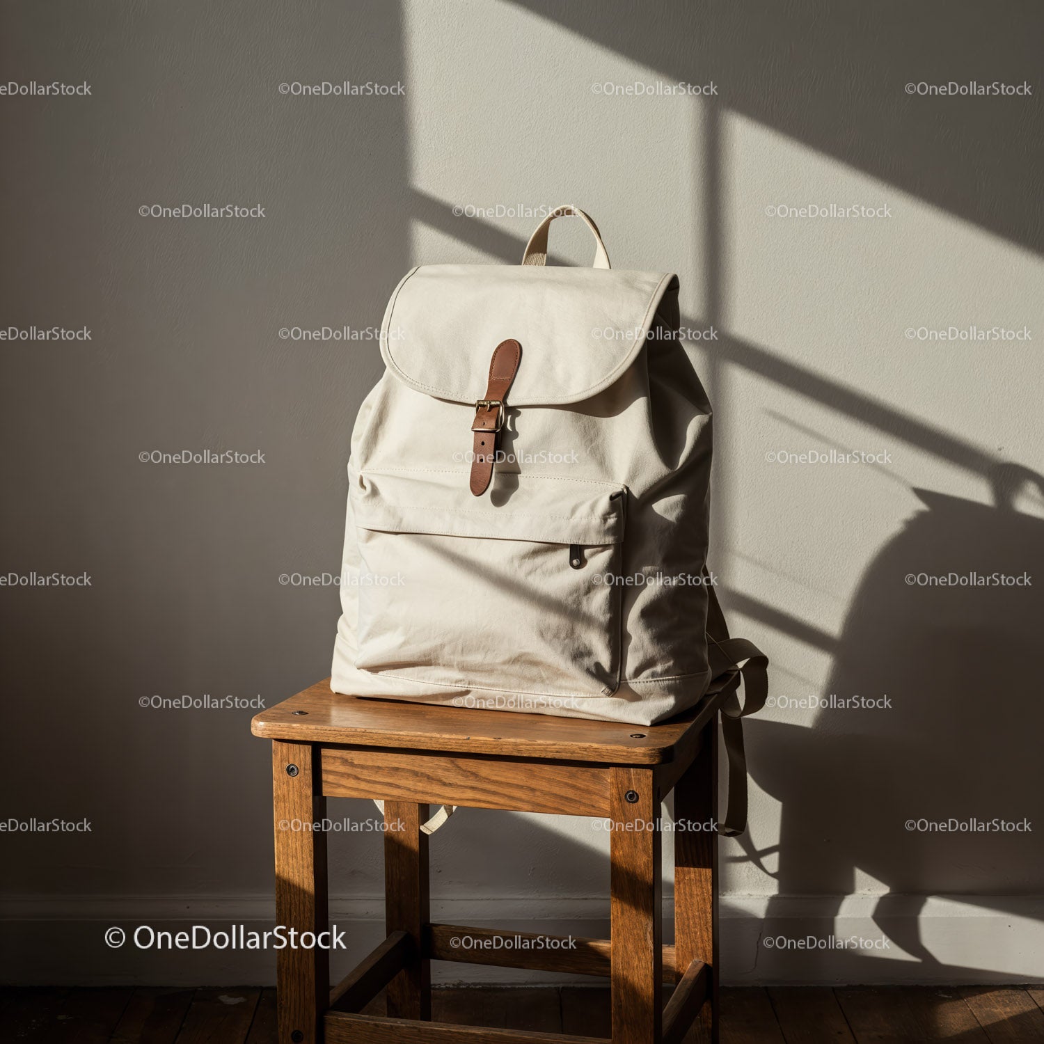 Beige Canvas Backpack on Wooden Stool with Sunlight