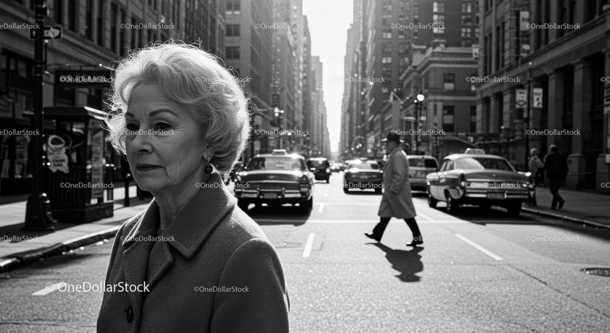 Black and White Urban Cityscape with Vintage Cars and Tall Buildings