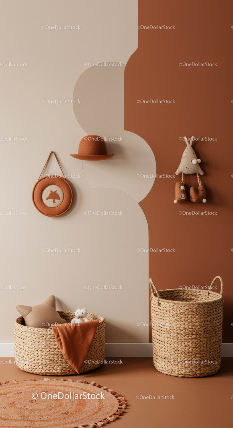 Boho Nursery Decor with Woven Baskets and Plush Animal Toys