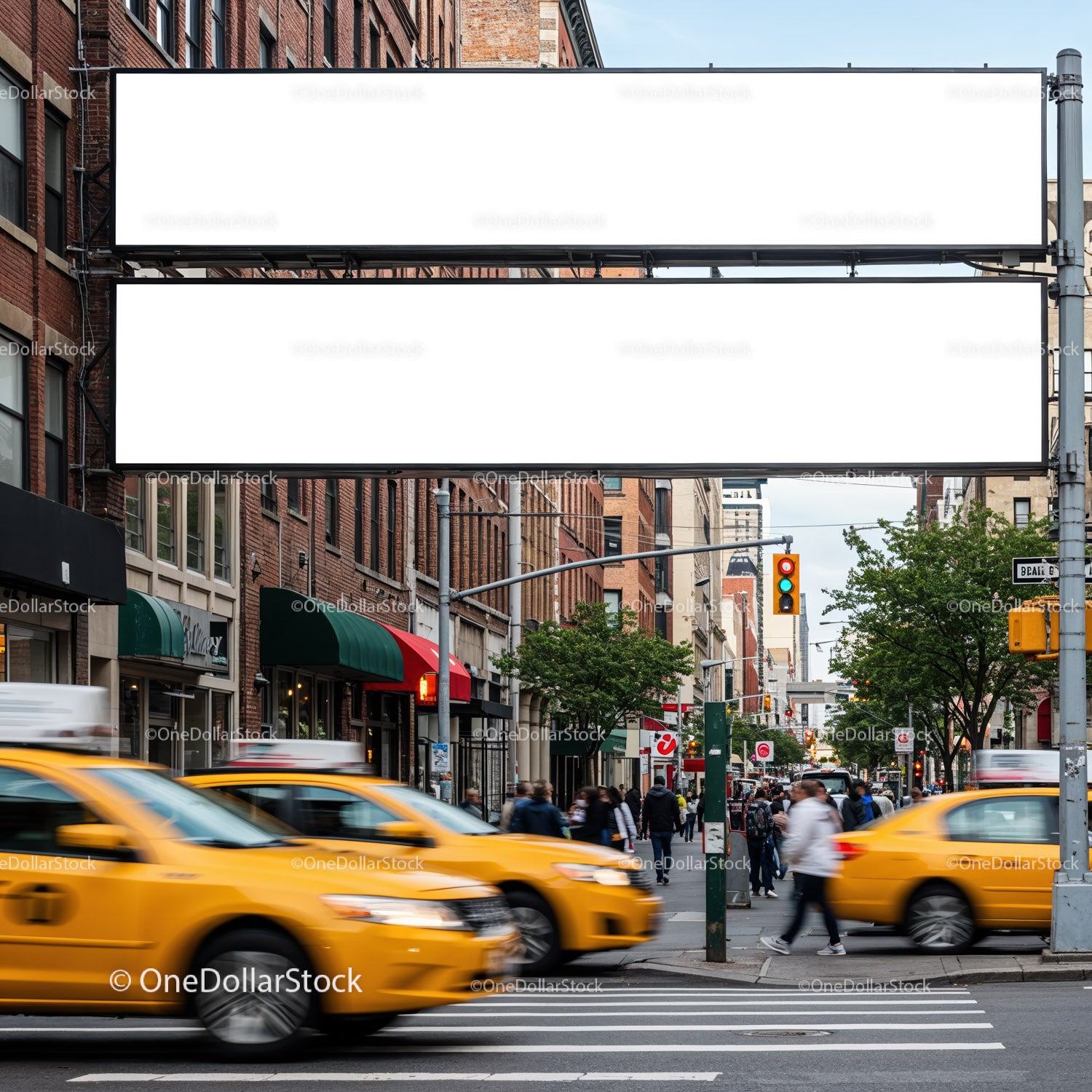 Busy urban street with yellow cabs and pedestrians crossing