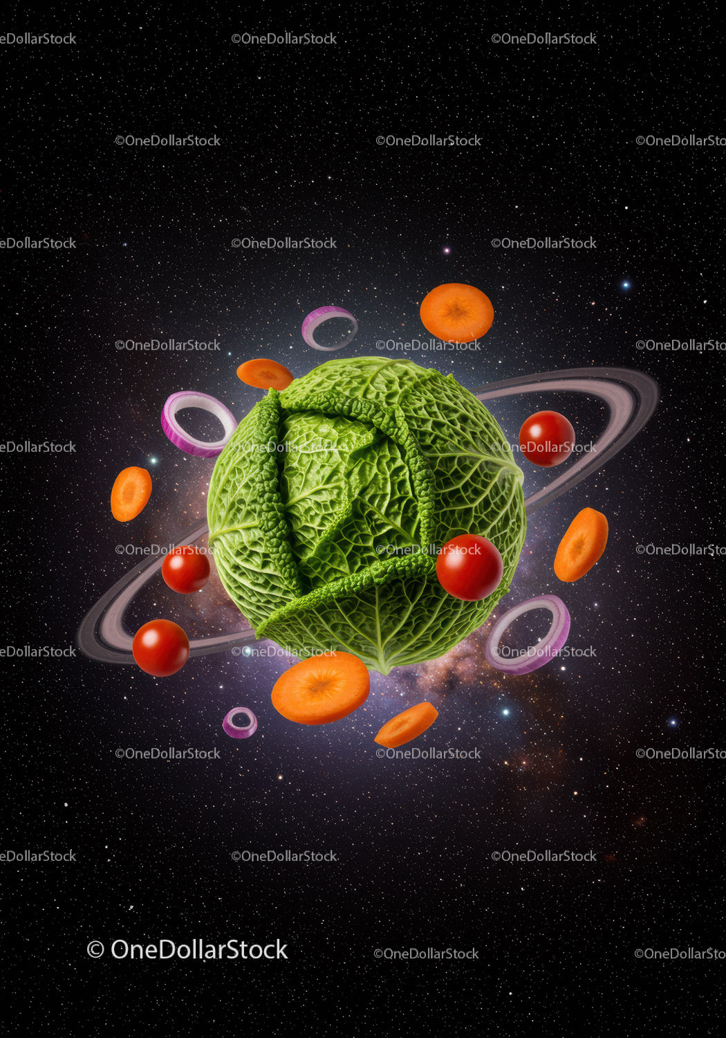 Cabbage Planet Surrounded by Floating Vegetables in Space