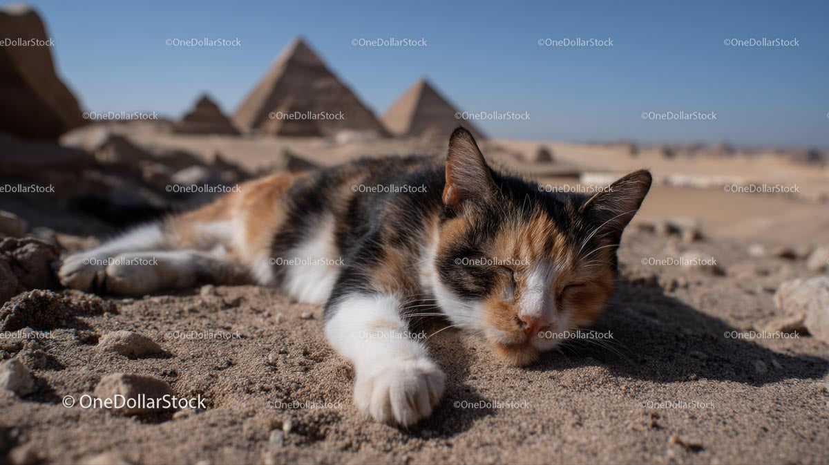 Calico Cat Sleeping by the Ancient Pyramids of Giza