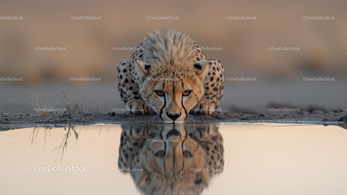 Cheetah Drinking at Water's Edge with Stunning Reflection