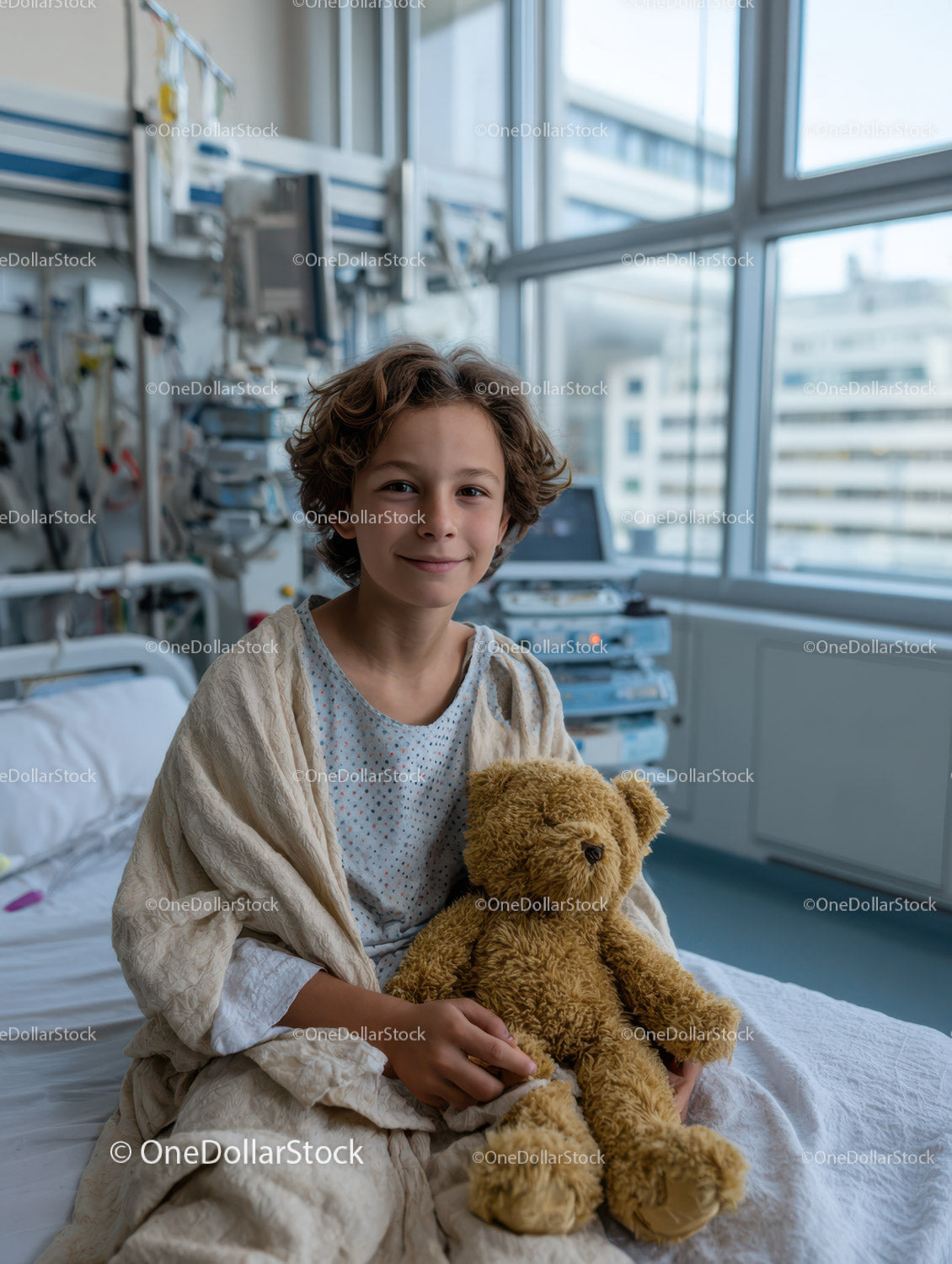 Child in Hospital Bed Holding Teddy Bear in Bright Medical Setting