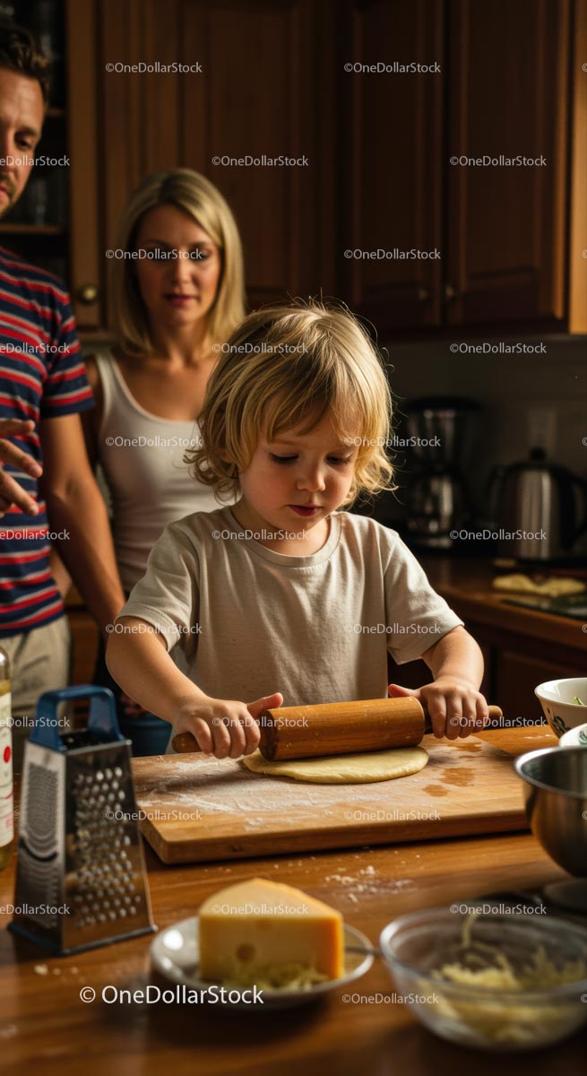 Child Learning to Bake with Parents in Cozy Kitchen