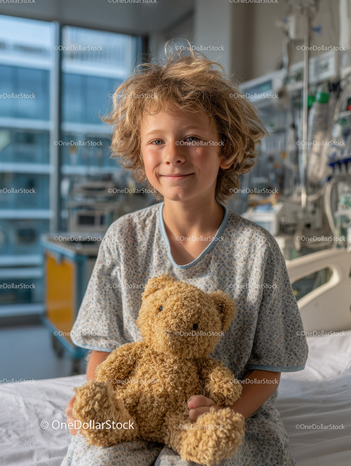 Child Patient Smiling with Teddy Bear in Hospital Room
