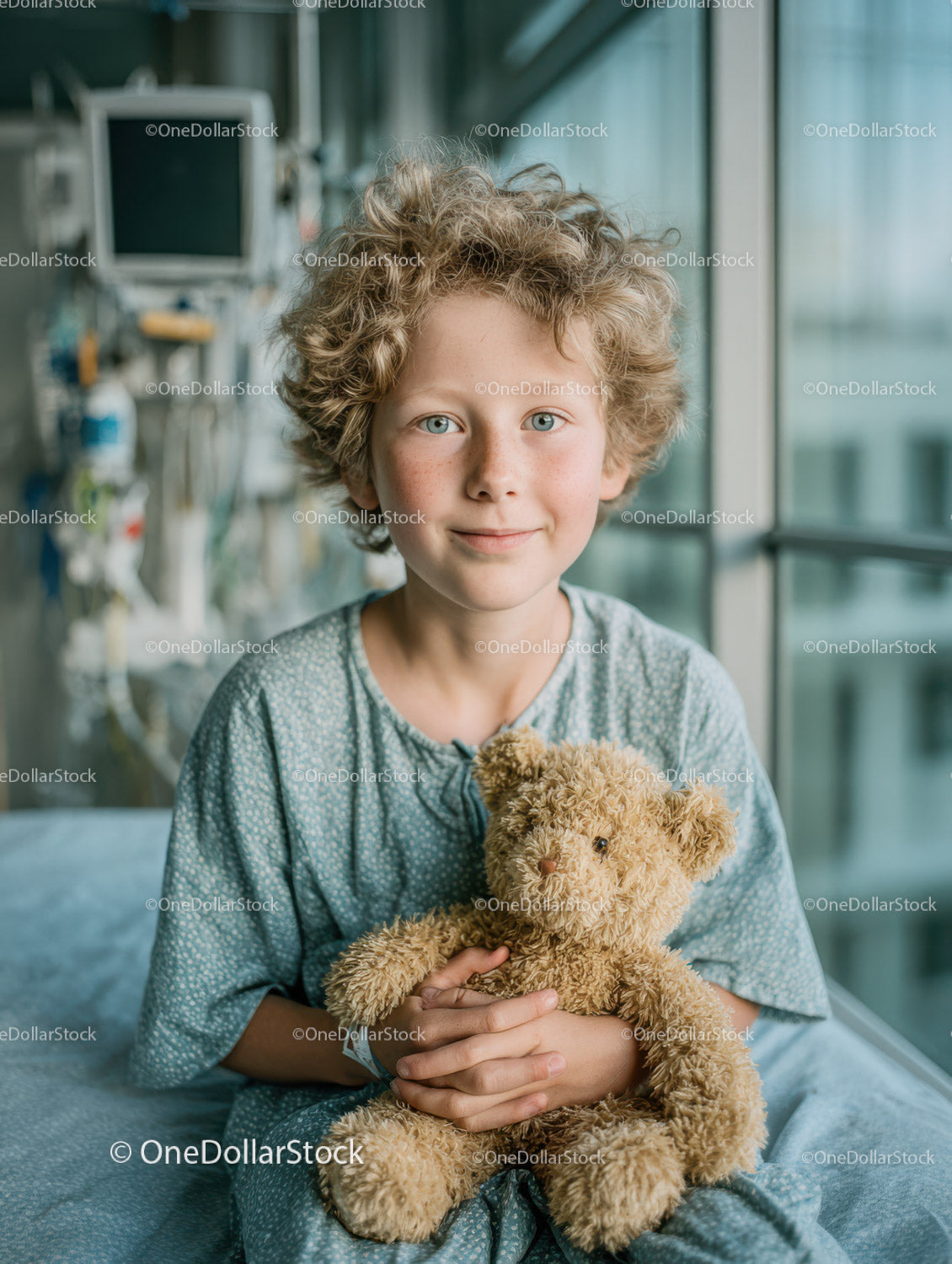 Child with Teddy Bear in Hospital Room Brightly Lit with Medical Equipment