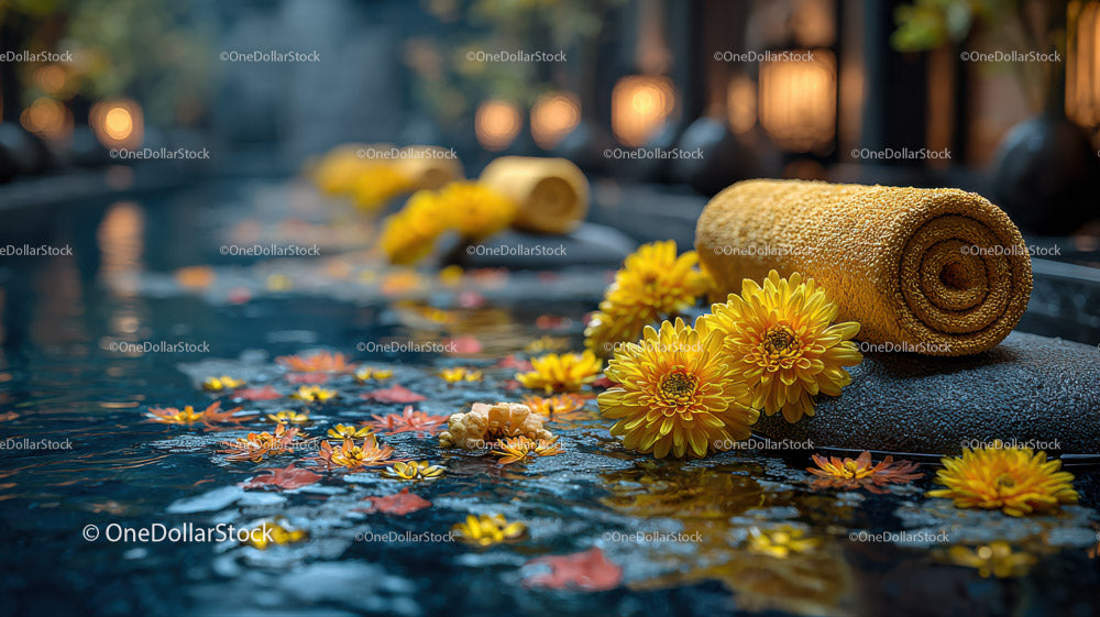 Chrysanthemum Flowers and Rolled Towel in Spa Pool with Floating Petals