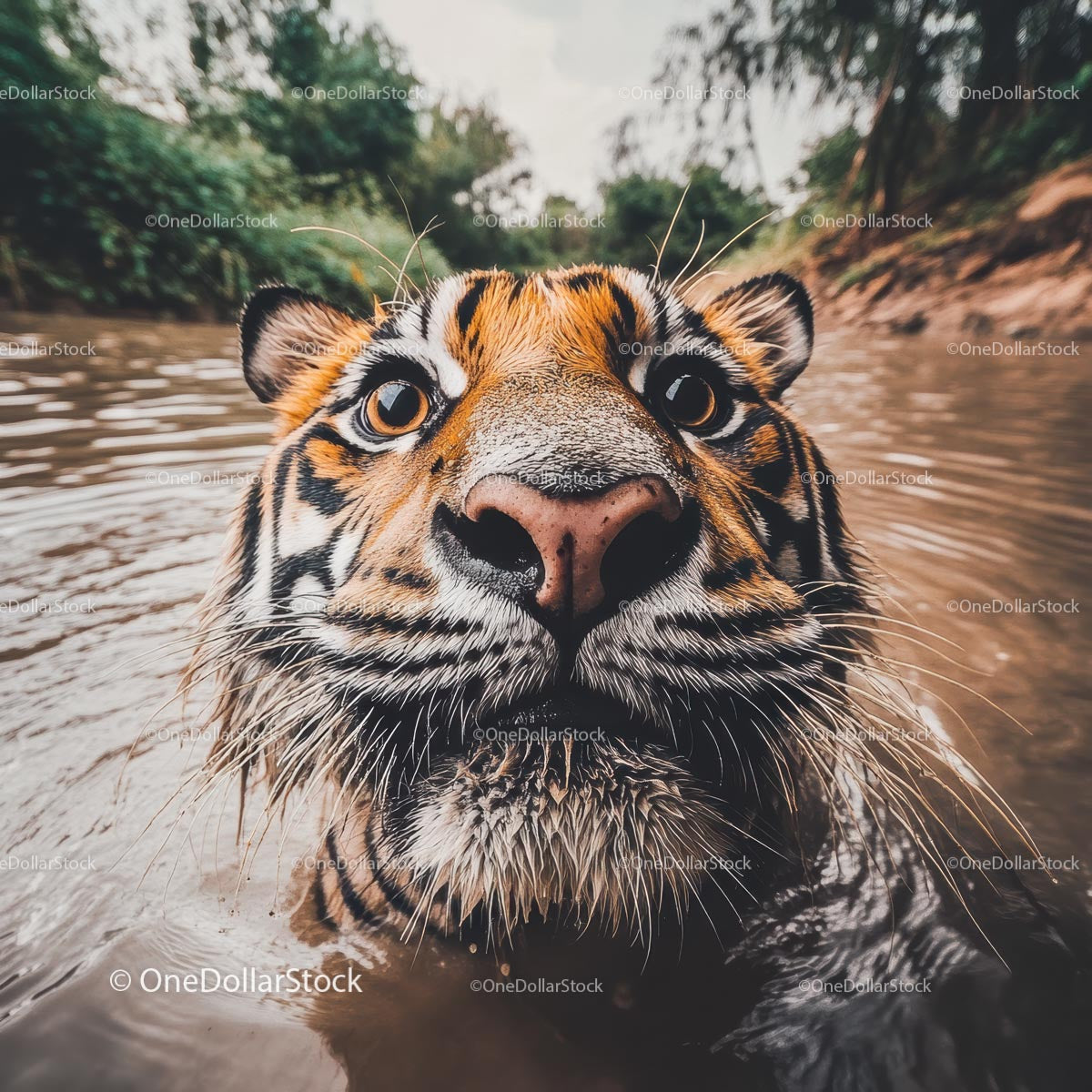 A captivating close-up of a Bengal tiger immersed in water, showcasing its striking face and piercing eyes. The tiger's distinctive striped fur and long whiskers are highlighted, capturing a moment of curiosity and natural beauty. The surrounding water and lush greenery suggest a wild, untamed jungle environment, emphasizing the majesty and power of this big cat in its natural habitat.