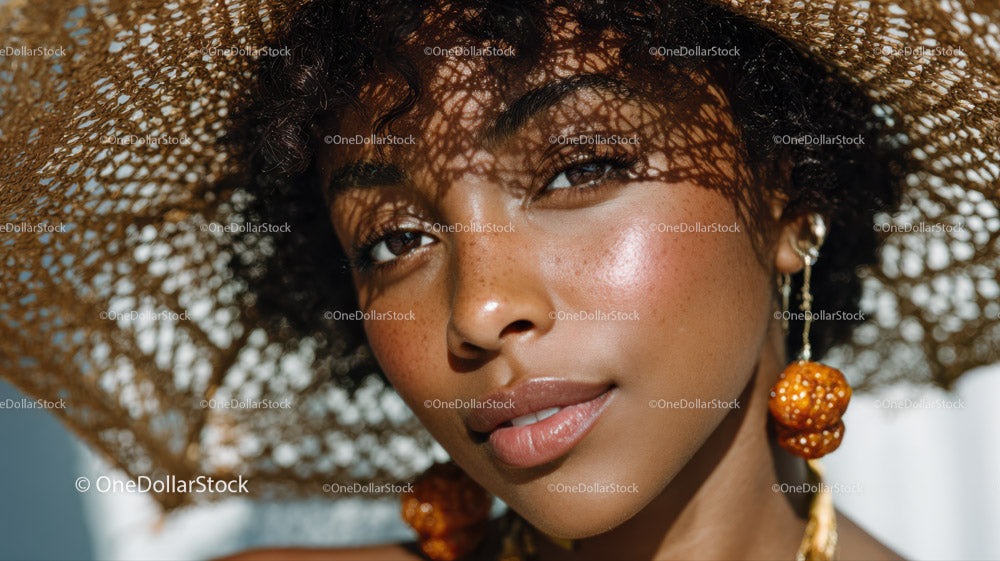 Close-up of a Smiling Woman Wearing a Straw Hat and Large Earrings
