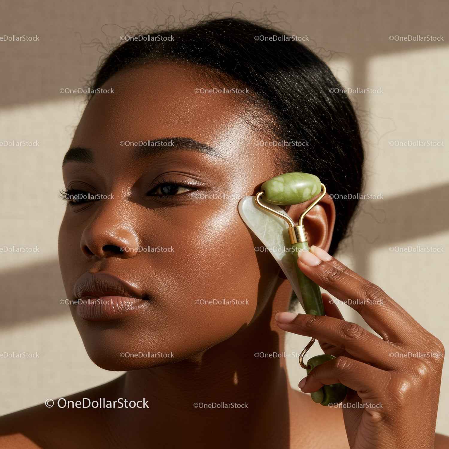 Close-up of a Woman Using a Jade Roller for Facial Skincare