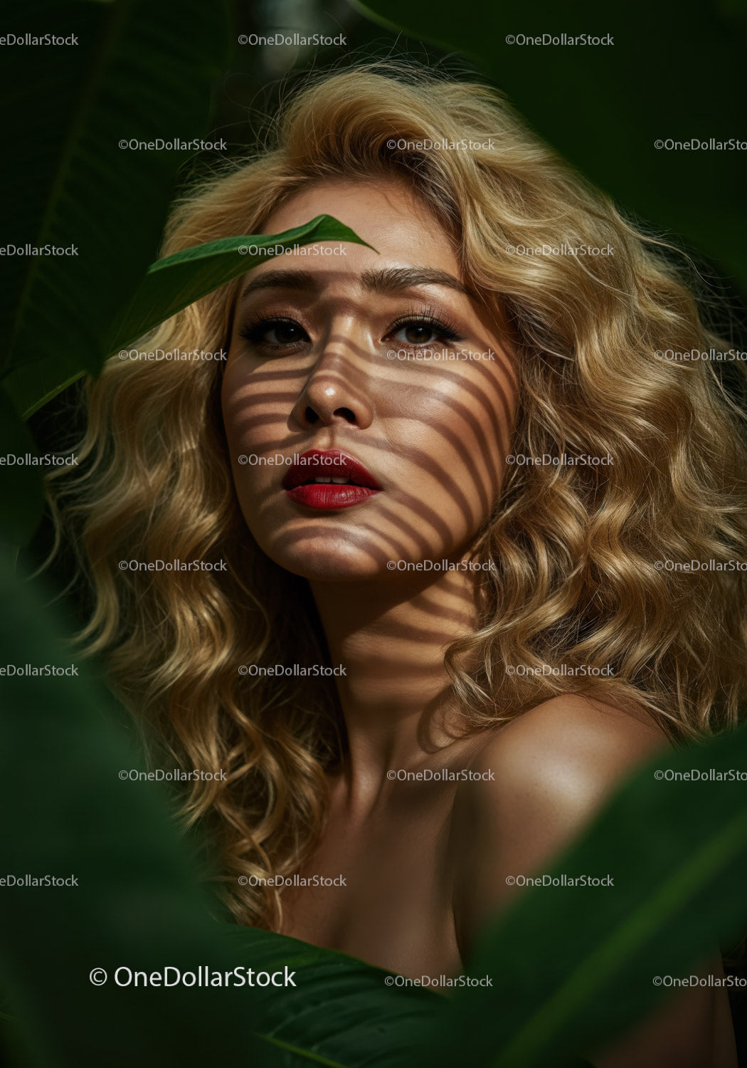 Close-up of Blonde Woman with Shadowed Face Among Tropical Leaves