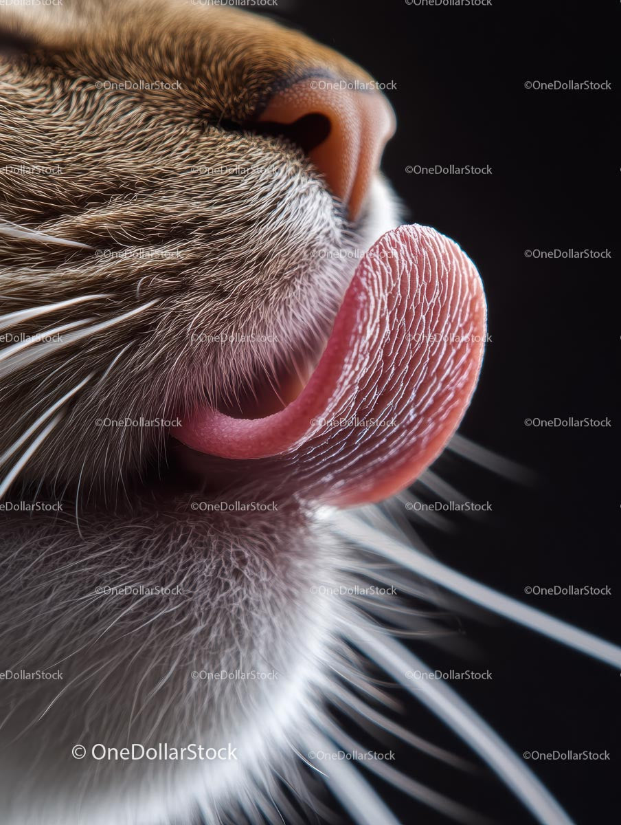 Close-Up of Cat Licking with Whiskers and Pink Tongue