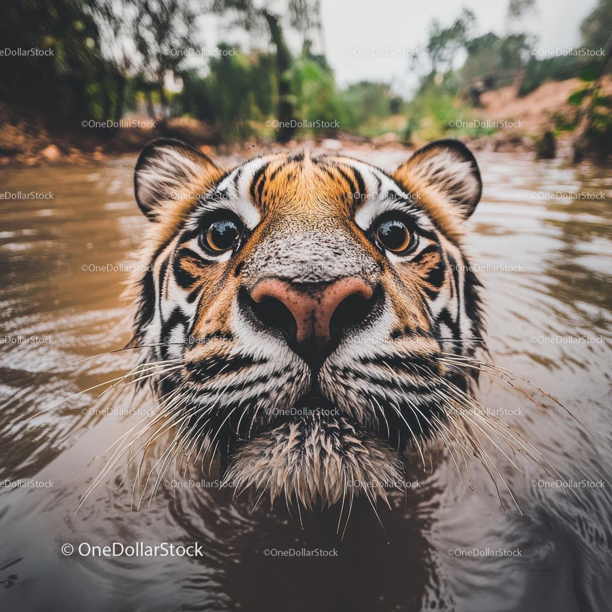 Close-Up of Curious Tiger Swimming in River