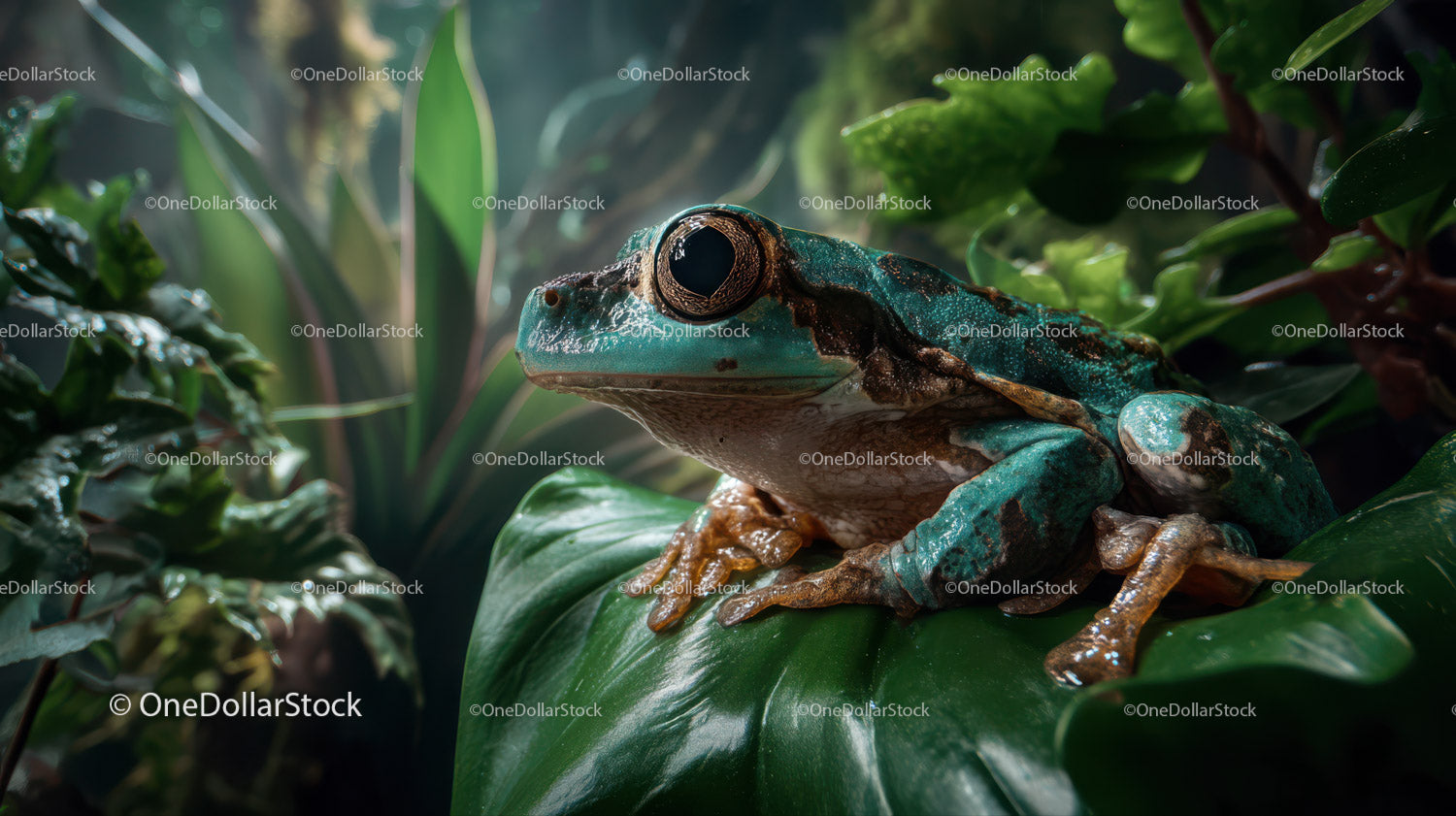 Close-up of Green Tree Frog Resting on Leaf in Tropical Environment