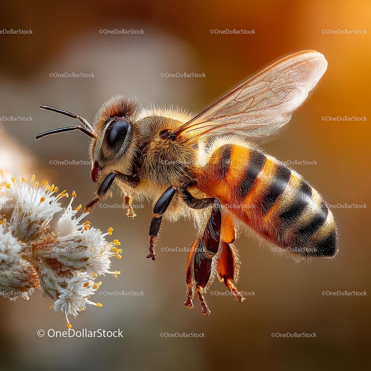 Close-up of Honeybee Pollinating a Flower in Sunlight