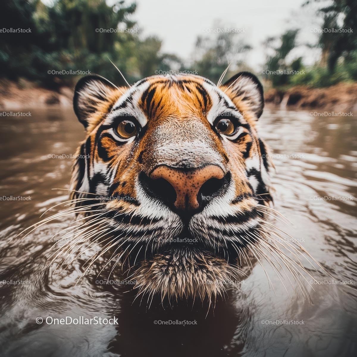 Close-Up of Majestic Tiger Swimming in Natural Habitat