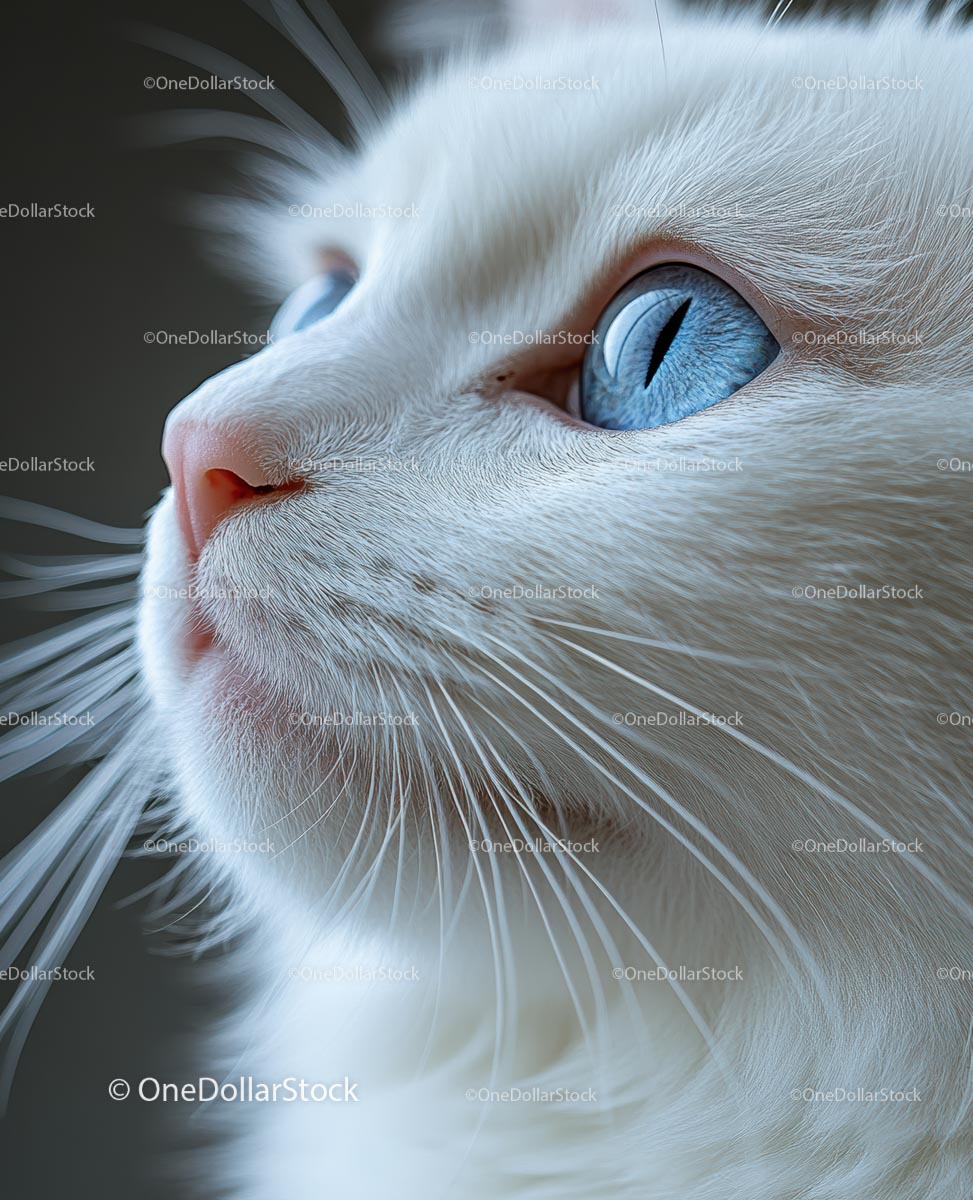 A captivating close-up of a white cat showcasing its striking blue eyes and soft, fluffy fur. The feline's inquisitive gaze is captured with a focus on its delicate whiskers and pink nose, emphasizing its gentle and playful nature. This image perfectly highlights the beauty and charm of domestic cats, making it ideal for pet enthusiasts and animal lovers.
