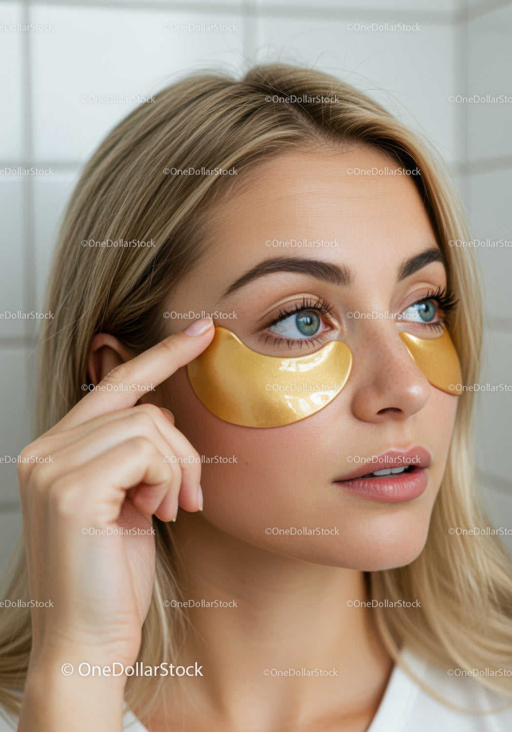 Close Up of Woman Applying Gold Eye Patches for Skincare Treatment