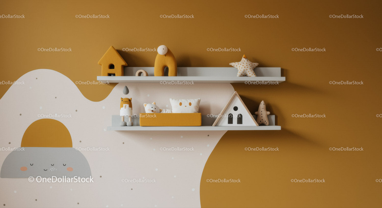 Colorful Nursery Decor with Wooden Toy Animals and Cloud Wall Mural