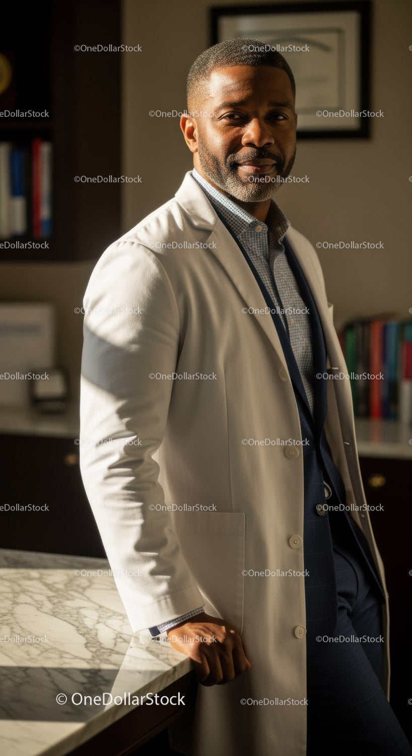 Confident Male Doctor in White Coat Standing in Modern Clinic
