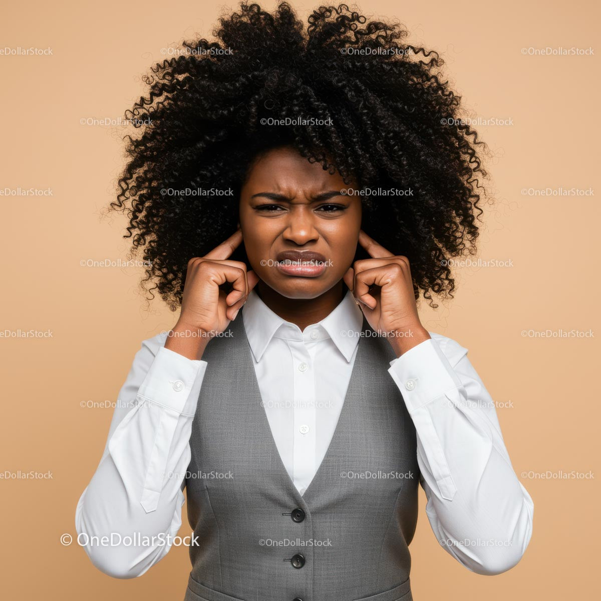 Confused Woman Covering Ears with Frustrated Expression in Business Attire