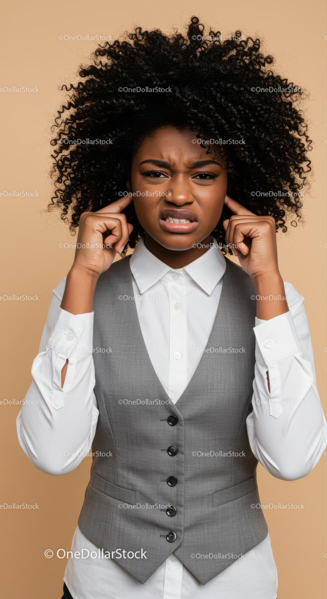 Confused Woman Expressing Frustration with Curly Hair in Business Attire