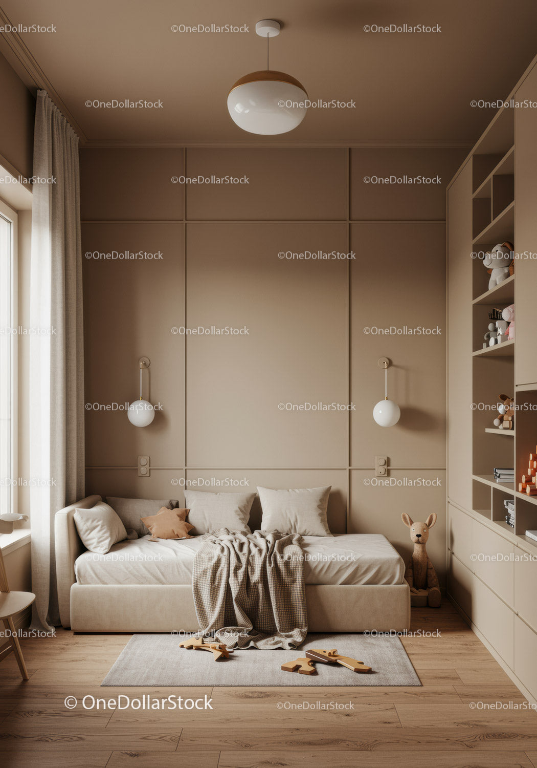 Contemporary Beige Nursery with Wooden Floor and Toy Shelf