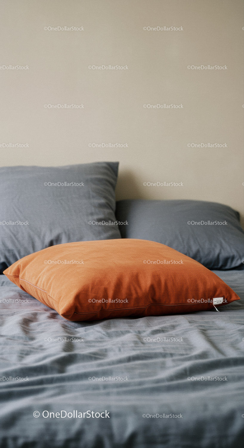 Cozy Bed with Grey and Orange Pillows in Modern Bedroom