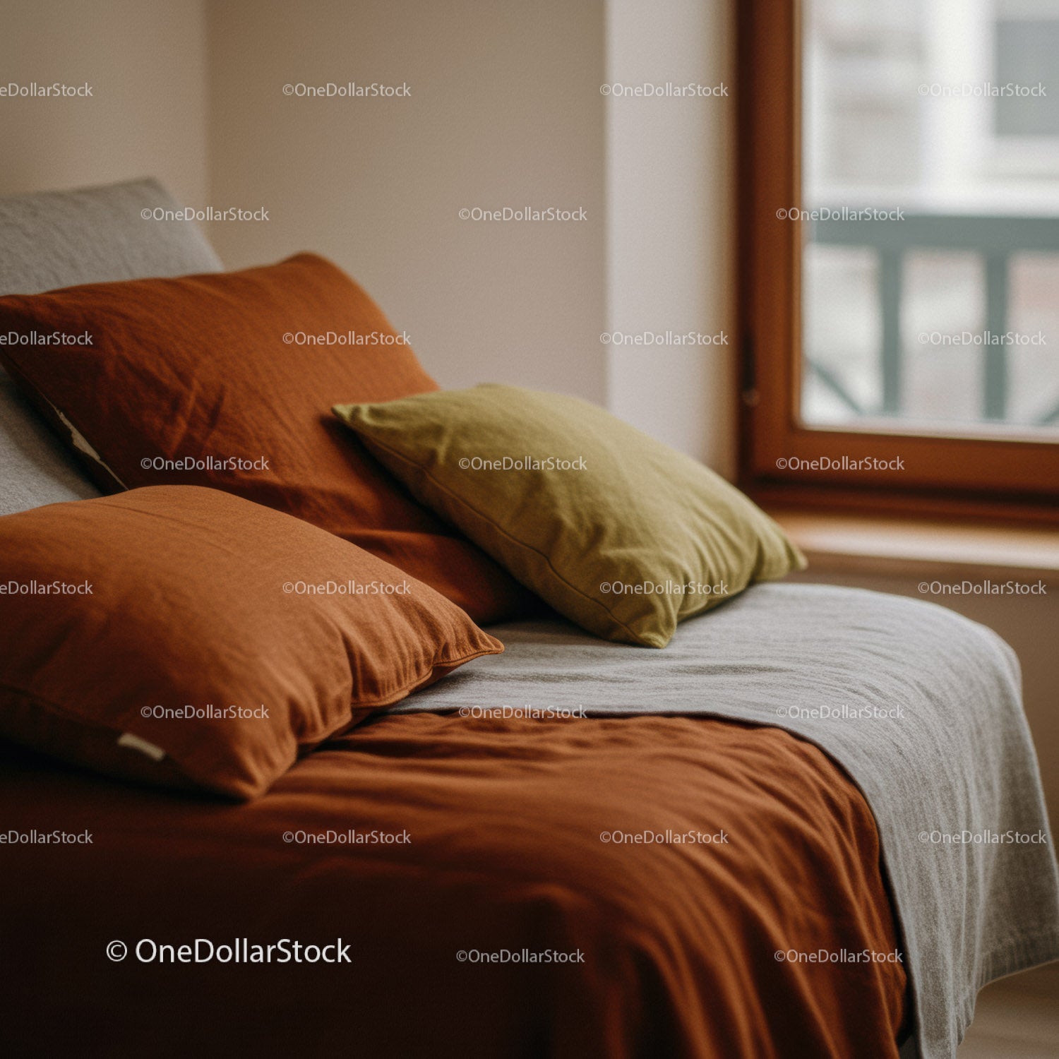Cozy Bedroom Bed with Pillows and Linen in Warm Earth Tones