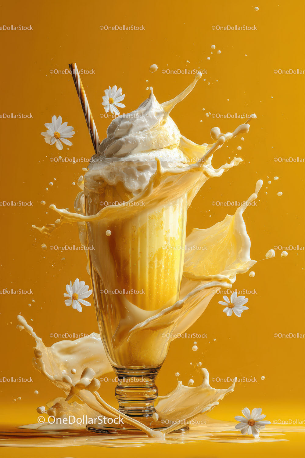 Creamy Milk Splash with Flowers in a Tall Glass on Yellow Background