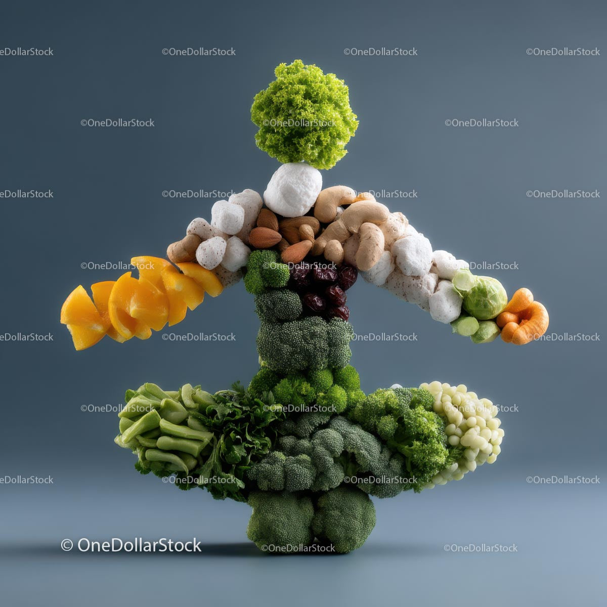 Creative Vegetable and Nut Sculpture on Blue Background