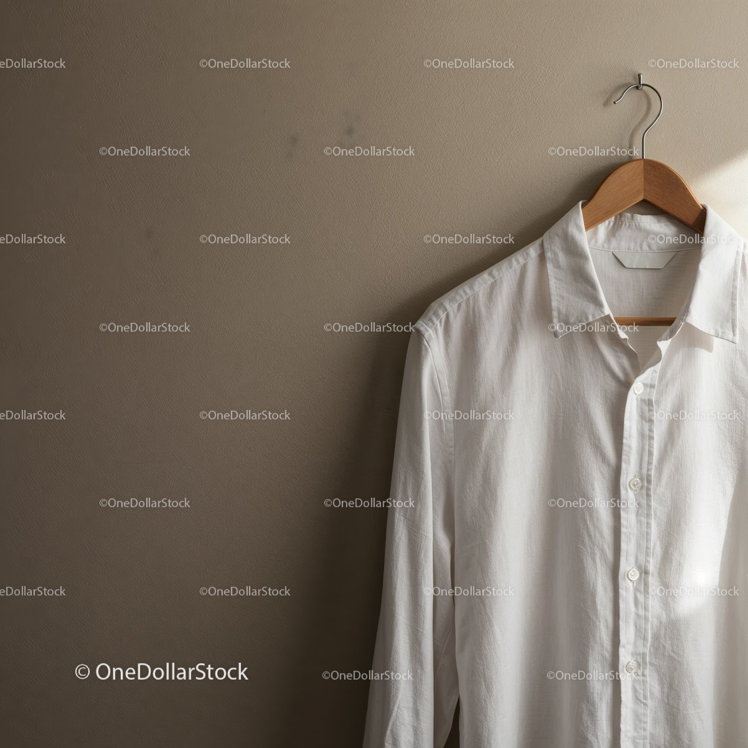 Crisp white shirt hanging on wooden hanger indoors